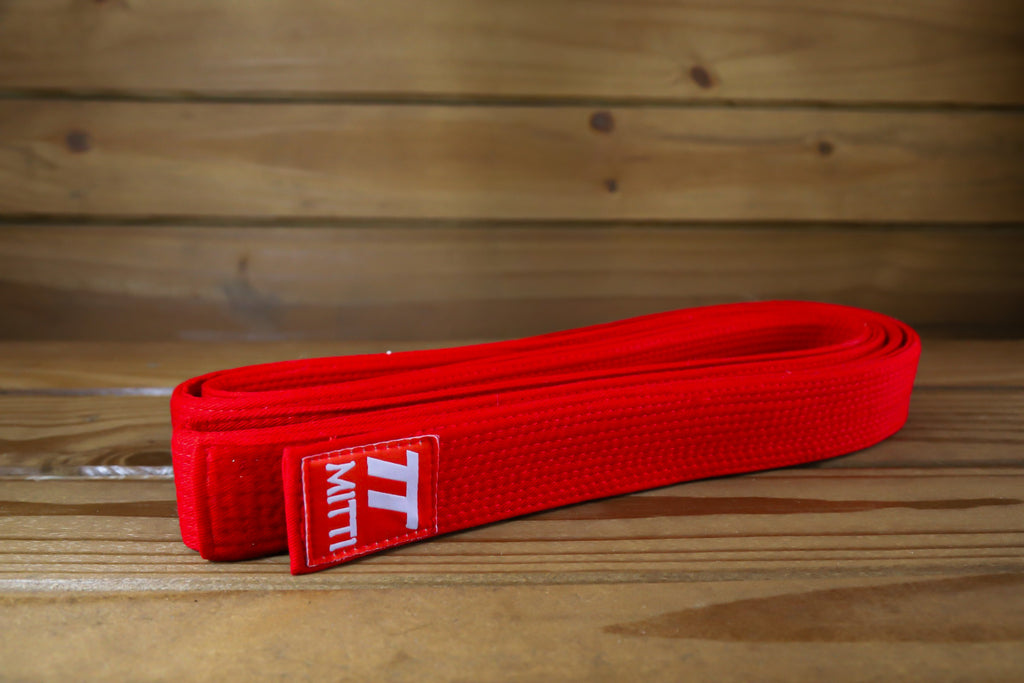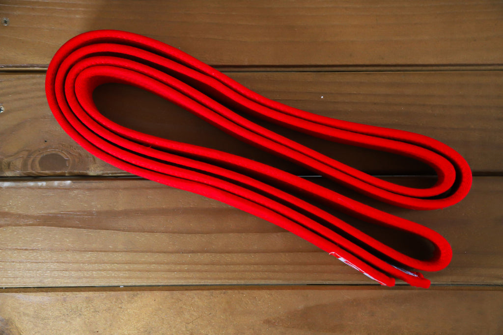 Belíssima faixa com 11 costuras na cor azul e vermelha (AKA e AO) para kata e kumite, alfaiataria tradicional mitti, com enchimento especial. Qualidade que só a mitti oferece. Não mancha, nem desbota.